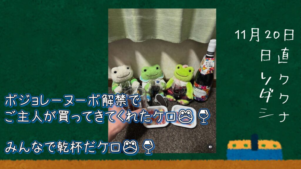ボジョレーヌーボ解禁でご主人が買ってきてくれたケロ🐸🍷