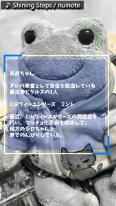 あおちゃん ヌシの車番として安全を担当している最古参ピクルスの1人 種族:ミルフィーユシリーズ ミント 最近、ミルフィーユシリーズの同窓会を行い、 マッチョ化手術も成功して、相方のシロちゃんと車でのんびりしている。